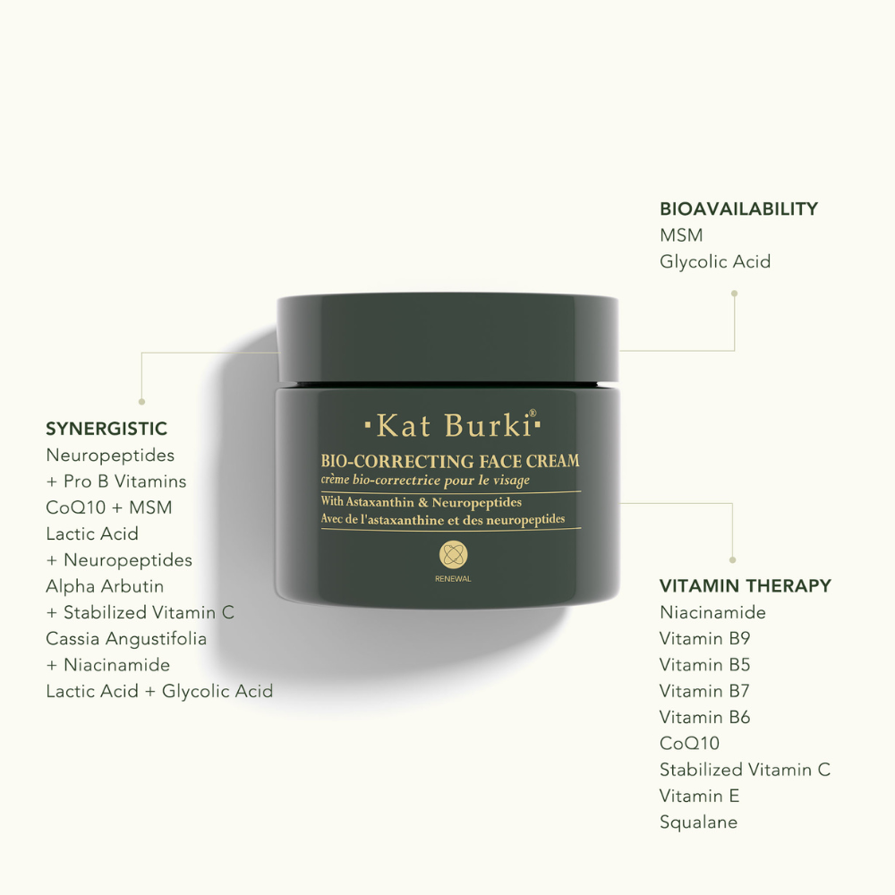 | Composition | Arnica montana (arnica) flower water*, centella asiatica (gotu kola) leaf water*, lavandula angustifolia (lavender) flower water*, calendula officinalis (calendula) flower water*, chamomilla recutita (matricaria) flower water*, cassia angustifolia (botanical hyaluronic acid) seed polysaccharide, squalane, alpha-arbutin, dimethyl sulfone (msm), glycerin, glyceryl stearate, isopropyl palmitate (palm oil), lactic acid, niacinamide (vitamin b3), aloe barbadensis (aloe) leaf juice, sodium ascorbyl phosphate (vitamin c), ubiquinone (coq10), tocopherol (vitamin e), tanacetum annuum (blue tansy) essential oil, undaria pinnatifida cell culture (wakame bioferment) extract, glycolic acid, folic acid (vitamin b9), astaxanthin, biotin (vitamin b7), acetyl hexapeptide-1, cucumis sativus (cucumber hydrosol) fruit water, camellia sinensis (green tea) leaf extract, ascorbic acid, citrus aurantium dulcis (orange peel) fruit extract, cymbopogon schoenanthus (lemongrass) oil, pyridoxine hydrochloride (vitamin b6), panthenol (vitamin b5), dipeptide diaminobutyroyl benzylamide diacetate, sclerotium gum, glycyrrhiza glaba (licorice) root extract, hydrangea arborescens (hydrangea) root extract, prunus virginia (wild cherry) bark extract, lecithin, lysolecithin, phytic acid, pullulan, sodium hydroxide, xanthan gum, potassium sorbate, sodium benzoate, tetrasodium glutamate diacetate, butylene glycol, lonicera caprifolium (honeysuckle) flower extract, lonicera japonica (japanese honeysuckle) flower extract, phenoxyethanol (less than 1%), ethylhexylglycerin.*kb5™ complex |